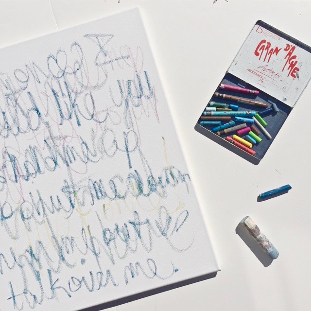 Write a letter that you would never send on a canvas or panel. I like to use oil pastels or water soluble crayons. Write things that are hard to say but still need to be acknowledged. Smear the words, erase the words, alter the words. Paint over the words using only your fingers, let it be a tactile experience. The bigger the piece you work on the better, let the whole body get involved. Write and paint, layer and alter. Notice how the feelings in the original letter might wane or intensify.