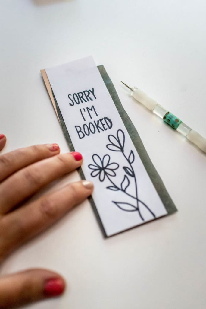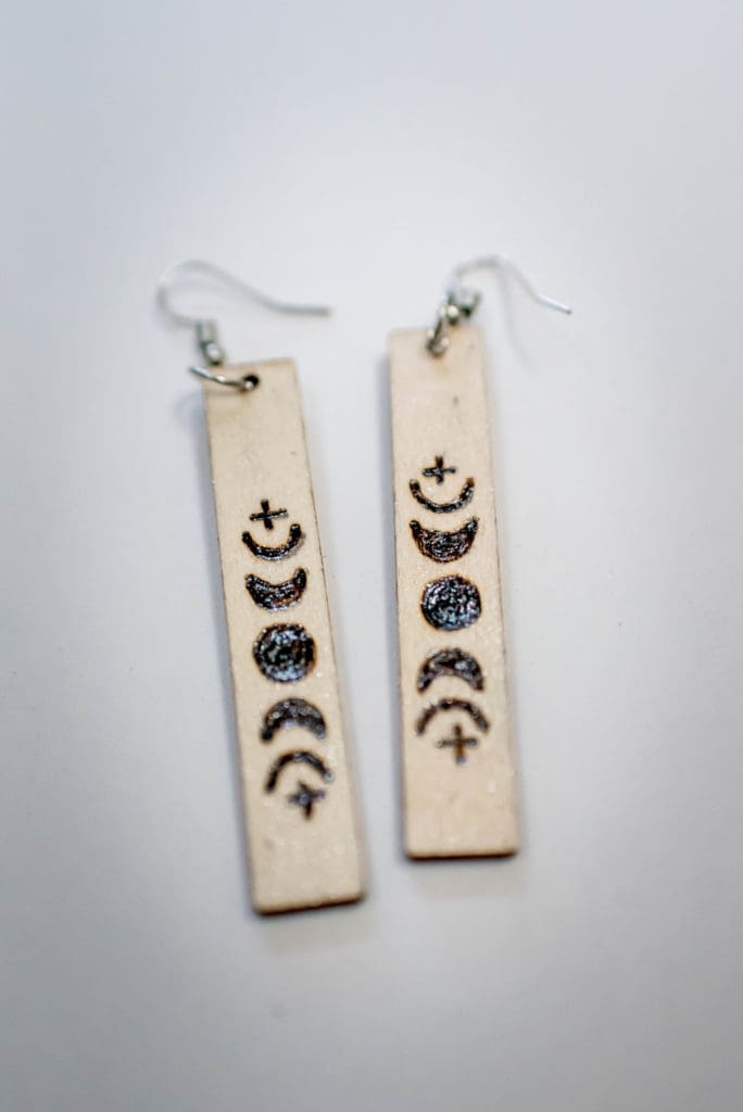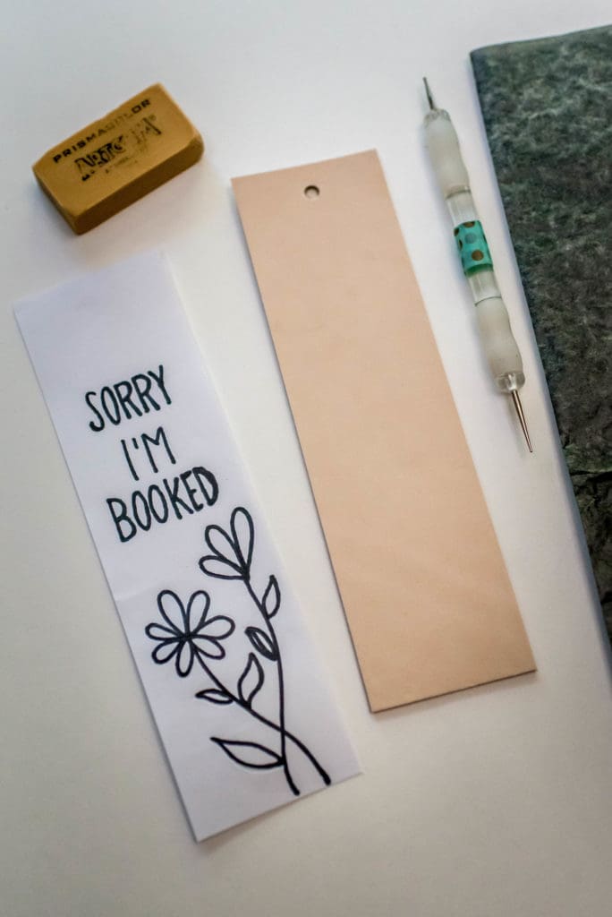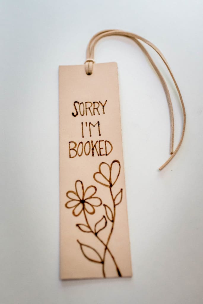 With this I made this super cute bookmark. Burning onto leather was probably my favorite. It was definitely the easiest and smoothest and I really love the look of it. I started by cutting a 2×7 strip out of the leather. I created my own stencil with a mix of my lettering and one of the freebie designs. I used the graphite paper and a stylus to transfer the design onto the leather and then burned over it with the Cone Point. I was able to use an eraser to erase away any of the graphite left, so cool!